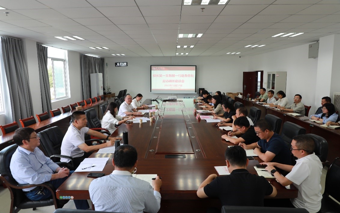 2025年10月17日,校长吴一文教授带队赴教务处、教育评估中心走访调研,副校长汪红教授,校办副主任丁瑞等同志陪同,教务处、教育评估中心全体教职工参加座谈,会议由副校长汪红主持。