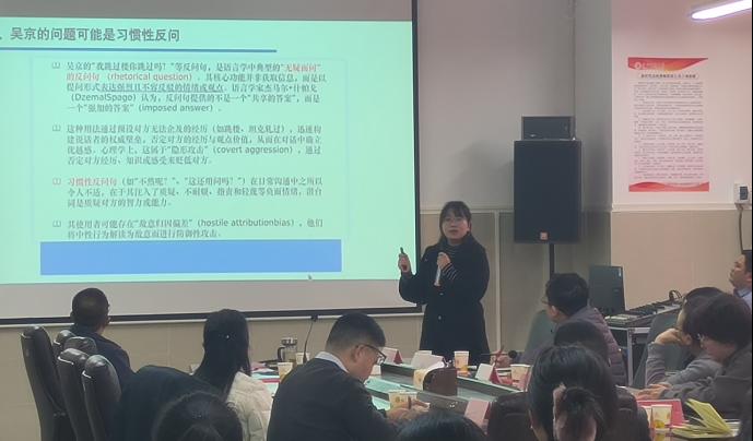 代阿鑫老师分享《语用学》课程建设经验,聚焦专业选修课的理论与实践融合创新。课程采用“线上预习+线下研讨”的混合式教学模式,推行“理论-案例-实践”三段式流程,通辩论、角色扮演等形式强化思辨训练。思政元素依托专业理论自然融入,通分析网络谣言阐释“合作原则”与社会诚信,结合跨文化对比弘扬中华“和”文化,教学效果获得学生广泛认可。